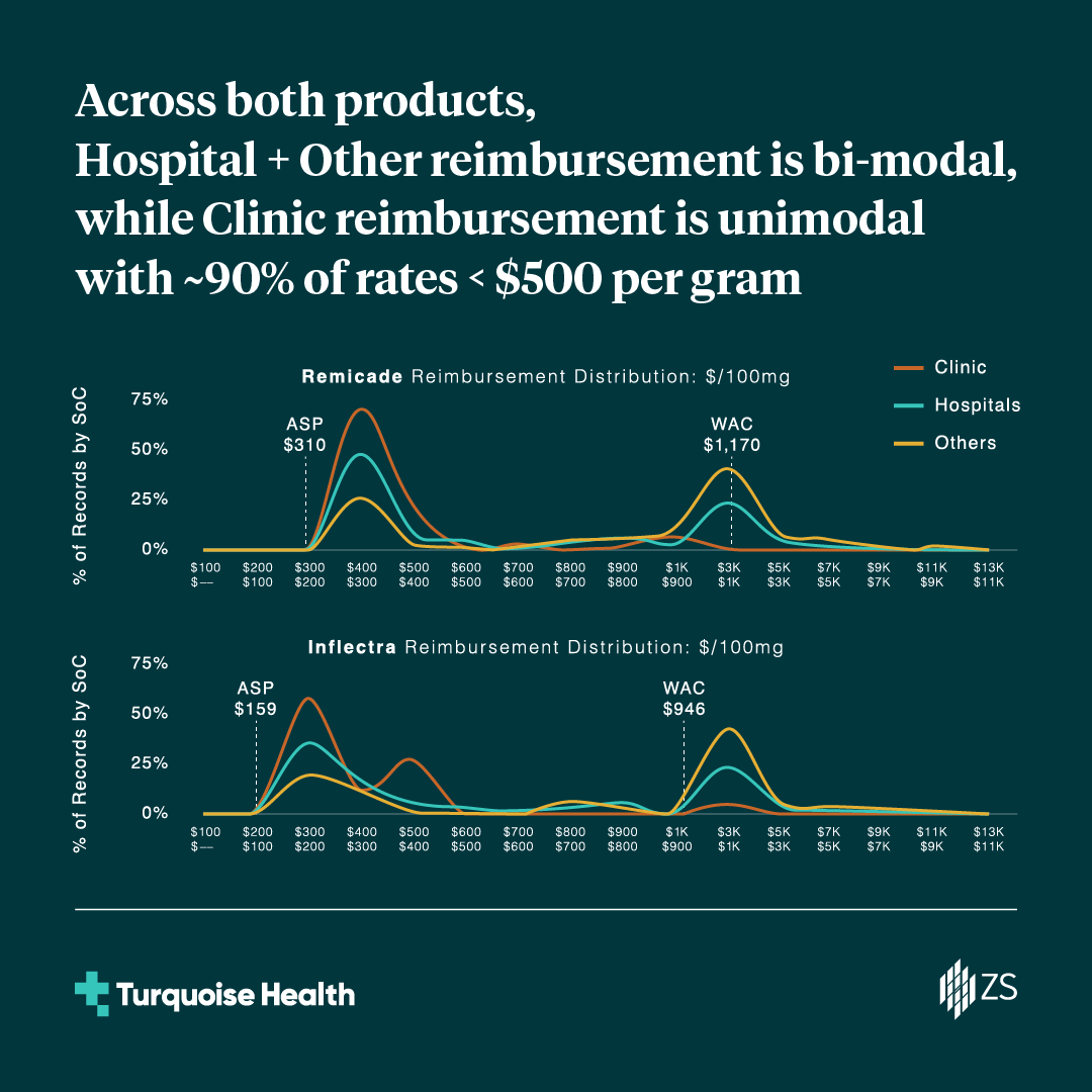 In this example, we can see that hospital-based infusions for Remicade and Inflectra (biosimilar) exhibit multi-modal reimbursement structures, indicating that there are likely underlying mechanisms influencing reimbursement.