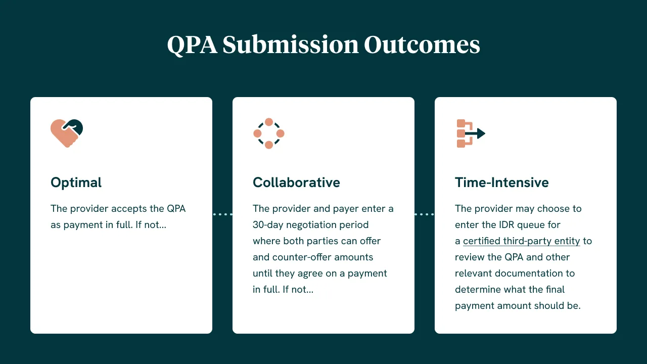 The IDR order of operations was seemingly designed under the assumption that a relatively small percentage of claims reimbursed via QPA would end up in the IDR queue. As defined within the NSA, once a payer calculates and subsequently issues a QPA payment to a provider, the process is as follows: