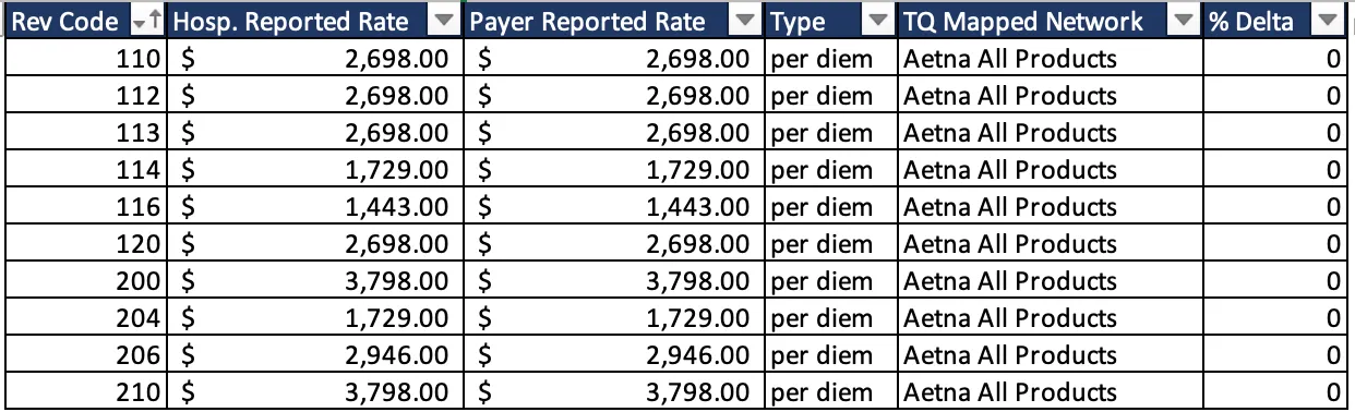 Rate parity between hospital and payer files doesn't just stop with Aetna in TX. BCBS of TX is a great place to explore next, as they've posted relatively complete files across the state. Have a look at additional per diem CSVs below: