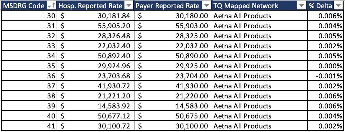 Let’s see the results. Below is a selection of the data where I found full parity between hospital and payer MRFs. Here's a snippet from Baylor Scott & White Medical Center, Brenham for Aetna Commercial Products: