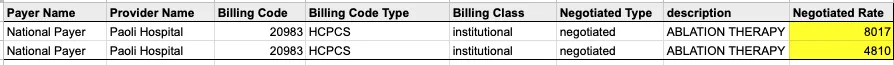 - If billing_code_type is ‘HCPCS’ or ’APC’ and negotiated_type is one of 'derived', 'fee schedule',or 'negotiated' and negotiated_rate > $500,000