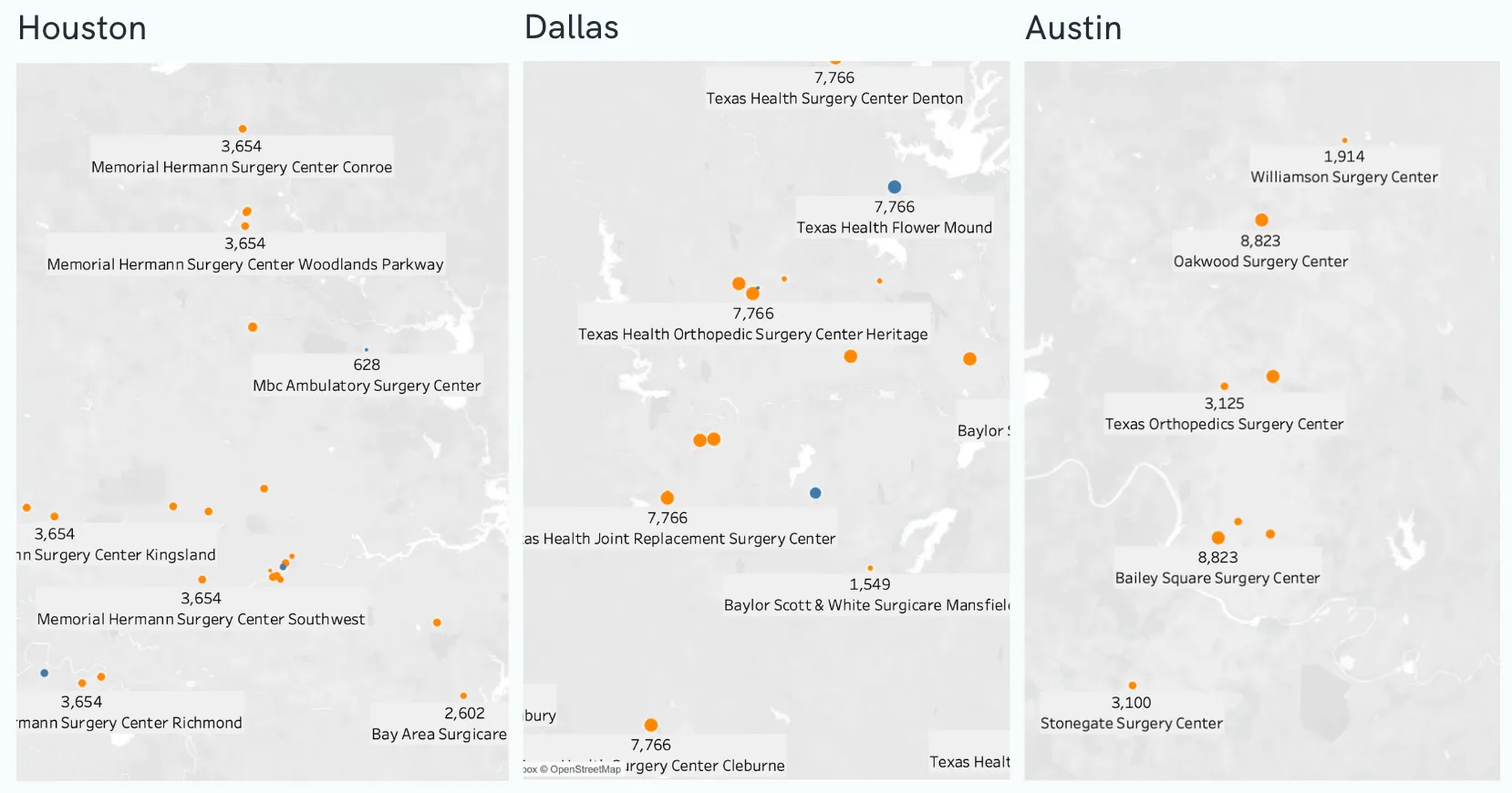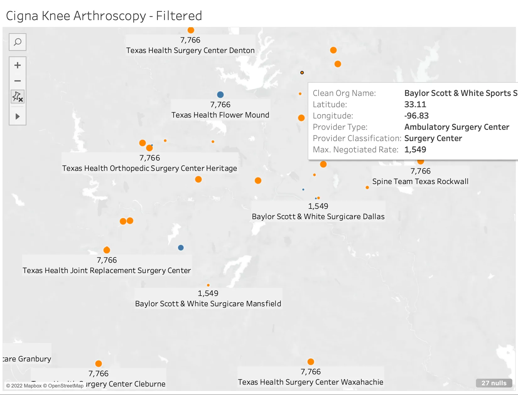 Here's what it looks like to map Cigna PPO rates across TX surgery centers for facility fees, CPT 29881 (a type of knee arthroscopy). Challenge: can you spot what looks off? (I hope so)