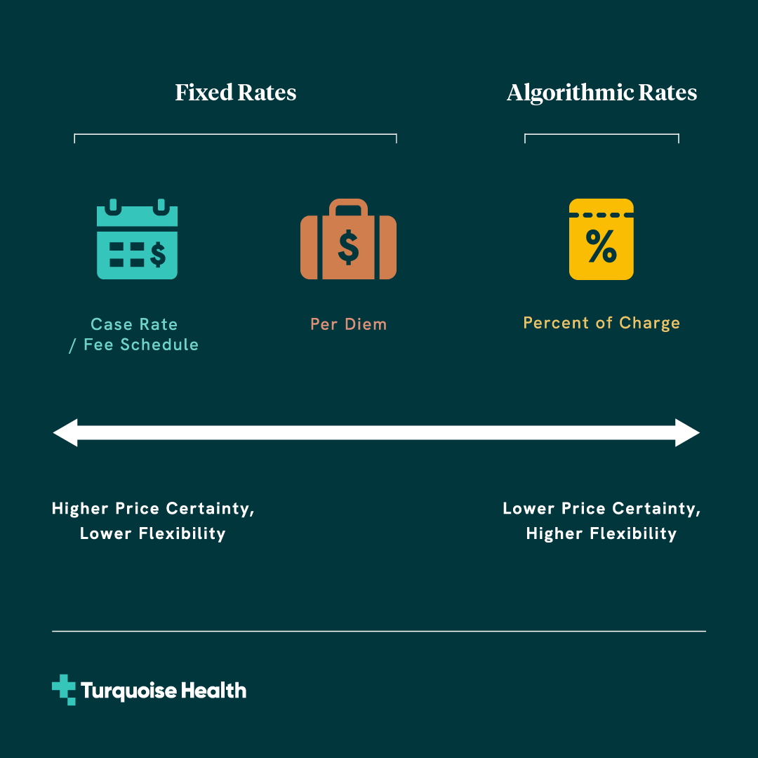* Here we include per diem rates as fixed rates given that base amounts are negotiated as fixed dollar amounts. Because total costs for per diem rates exhibit some variability due to variation in length of stay, per diem rates can be considered somewhat of a hybrid between fixed and algorithmic rates, with moderate price certainty and moderate flexibility to align rates with provider costs.