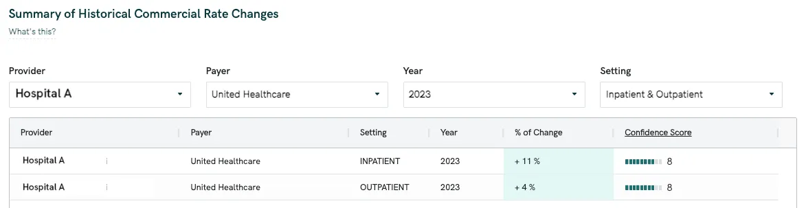 Say you’re going into negotiations with your biggest payer or health system. Access to historical rates allows you to calculate the exact percent of rate change year over year. And it’s not just your own historical rates we’re talking about either, because we know there’s a lot of valuable insight to be gained from the results of other hospital or payer negotiations.