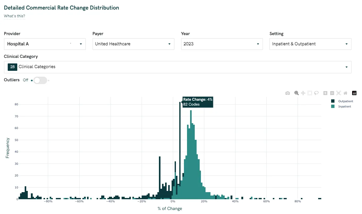 Maybe you want to explore the outcomes of a specific payer/provider negotiation. You can run a report in Analyze and see that Hospital A had an 11% increase in the inpatient setting and a 4% increase in the outpatient setting.