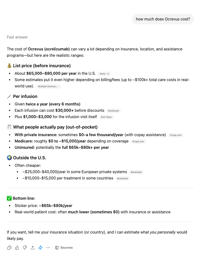 If a patient were to ask ChatGPT, “What does Ocrevus cost?” Here’s what ChatGPT will tell them: first, it will say it’s “searching the internet,” then it’ll say “List price (before insurance) About $65,000–$80,000 per year in the U.S. Some estimates put it even higher depending on billing/fees ” along with citation links to costs reported by news outlets. In this case, Multiple Sclerosis News Today, Bookimed, and Drugs.com. “The bottom line,” ChatGPT says, “With private insurance: sometimes $0–a few thousand/year (with copay assistance)."